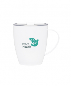 12 oz double wall 18/8 stainless steel thermal mug with copper vacuum insulation, clear acrylic push-on lid, and matching swivel; Hand wash recommended; Do not microwave; 4-7/16" h x 4"w (4-7/8 with handle) ; 355mL.