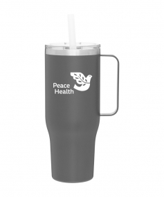 40 oz double wall 18/8 stainless steel thermal mug with copper vacuum insulation, stainless steel rim, dual-purpose push-on clear lid, matching sliding closure, flexible wide silicone straw, and powder coated finish. Individual gift box. Hand wash recommended. Do not microwave. Complies with FDA, Prop 65. 9.75" H x 4" W