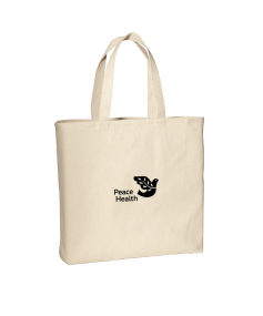 10 Oz., 100% cotton twill with cotton web handles. Approx. 588 cubic inches. Complies with Prop 65. 14" W x 14" H x 3" D